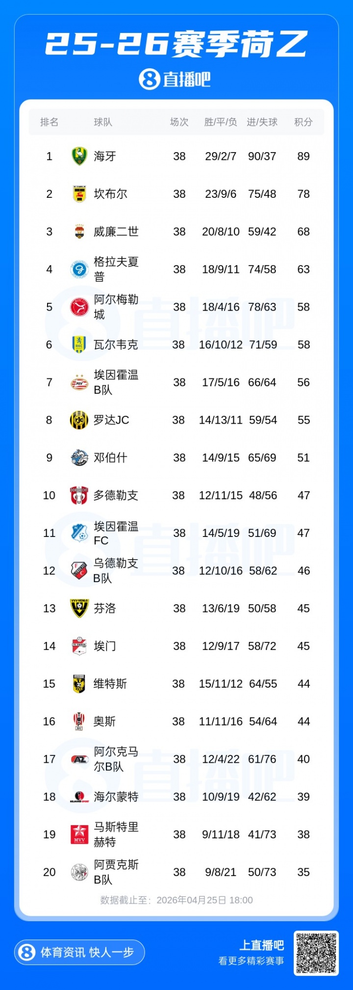 不过随着维特斯末轮1-2惨遭坎布尔绝杀,邓伯什连续两个赛季拿到附加赛席位。6支球队将通过附加赛来争夺最后一个升级荷甲的名额。